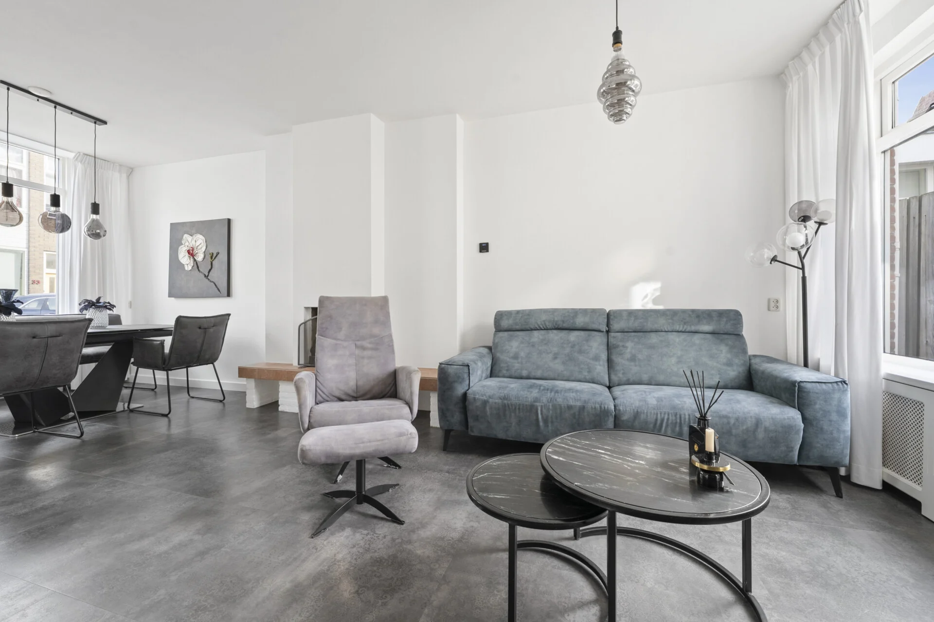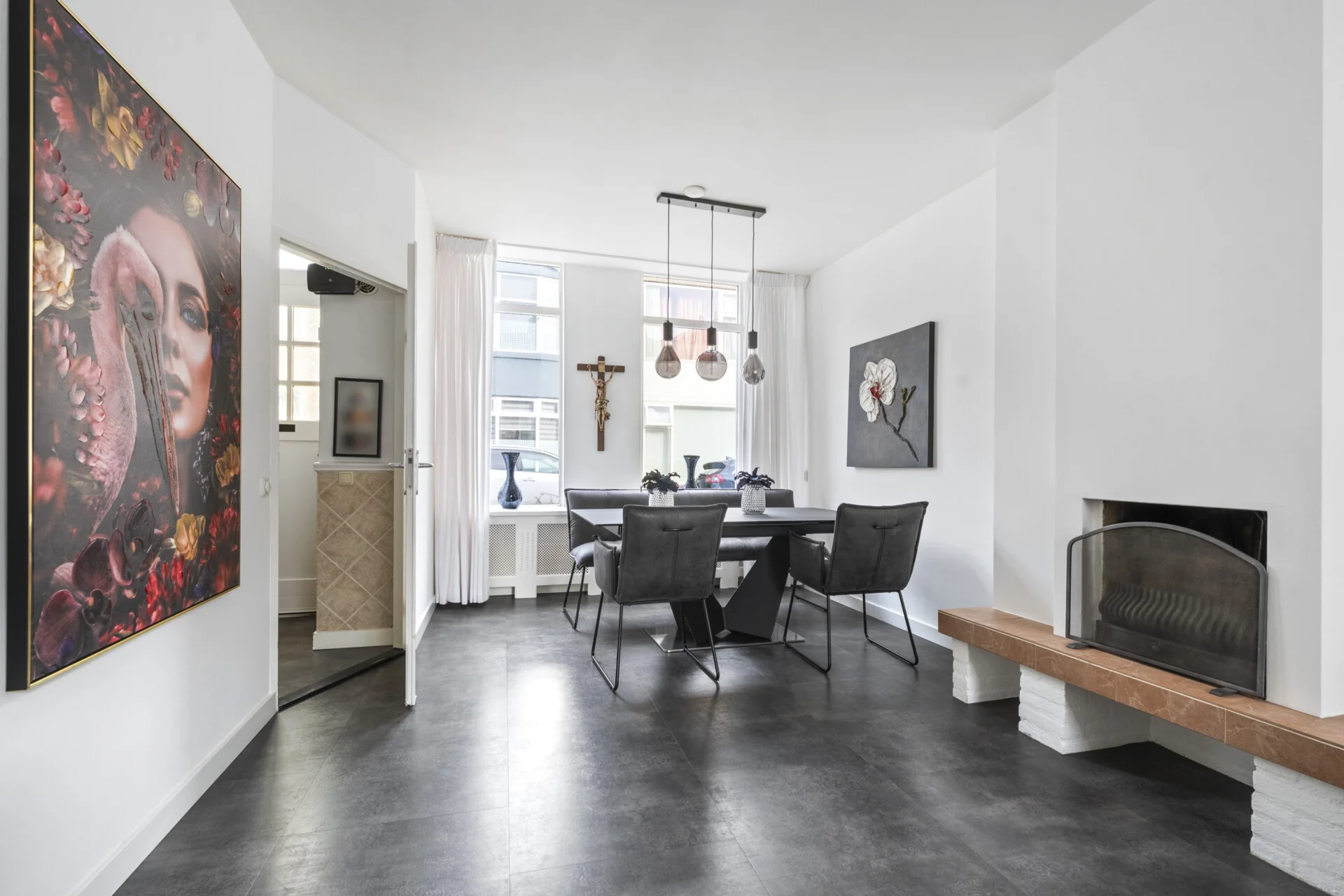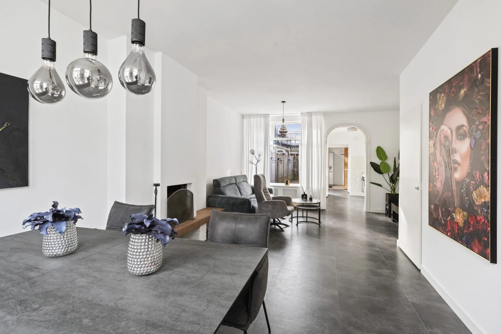 Binnen zet die sfeer zich moeiteloos voort. De woonkamer is opvallend ruim en heeft bovendien een prettige hoogte – je kunt het gerust de “extra large” versie noemen van de huizen in dit genre. Er is alle ruimte om sfeervol in te richten en verschillende woonstijlen passen hier moeiteloos, dankzij de strakke basis van gestucte wanden, plafonds en de betonnen/stenen vloer. De open haard zorgt daarbij voor extra gezelligheid en warmte.