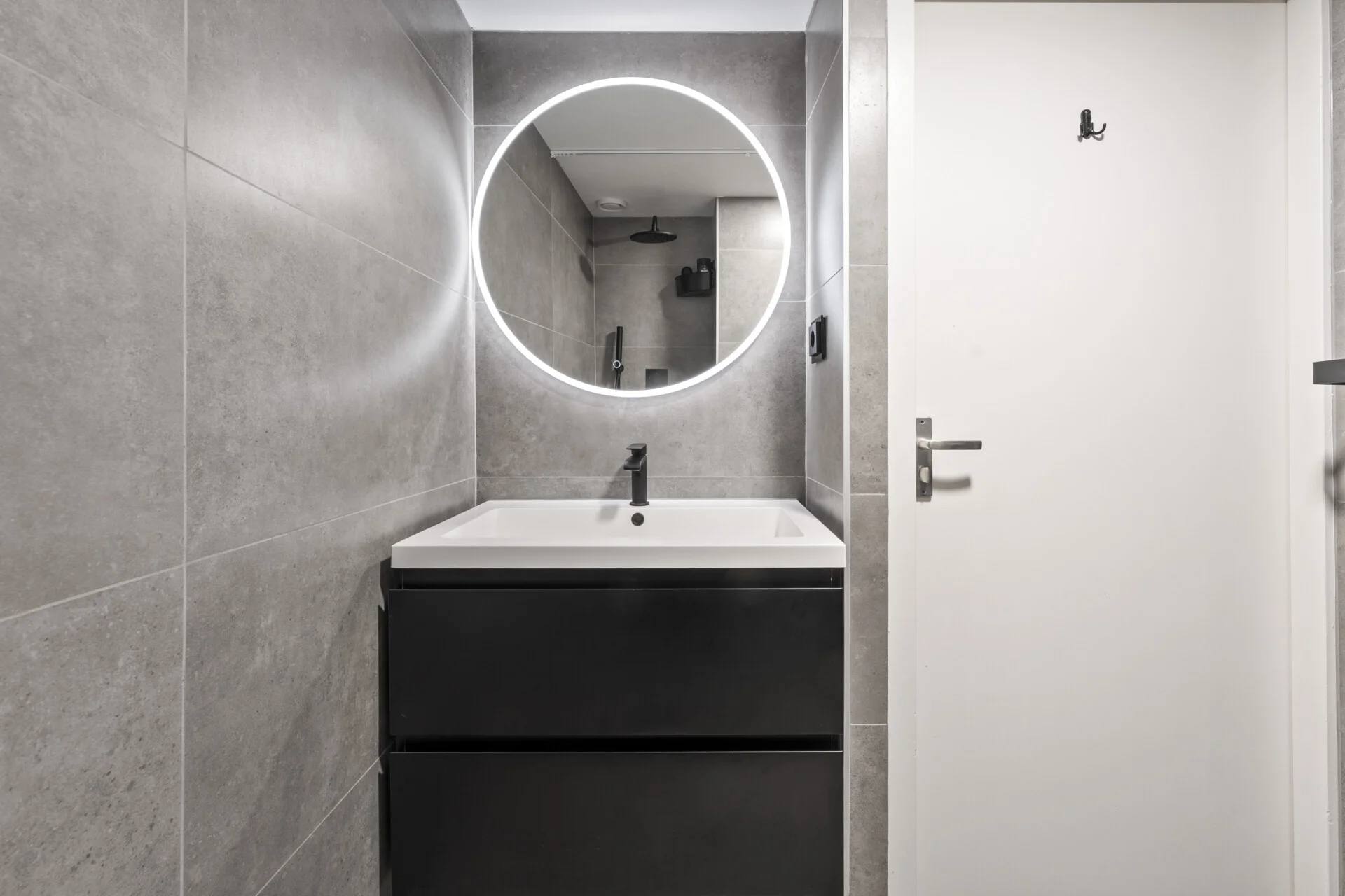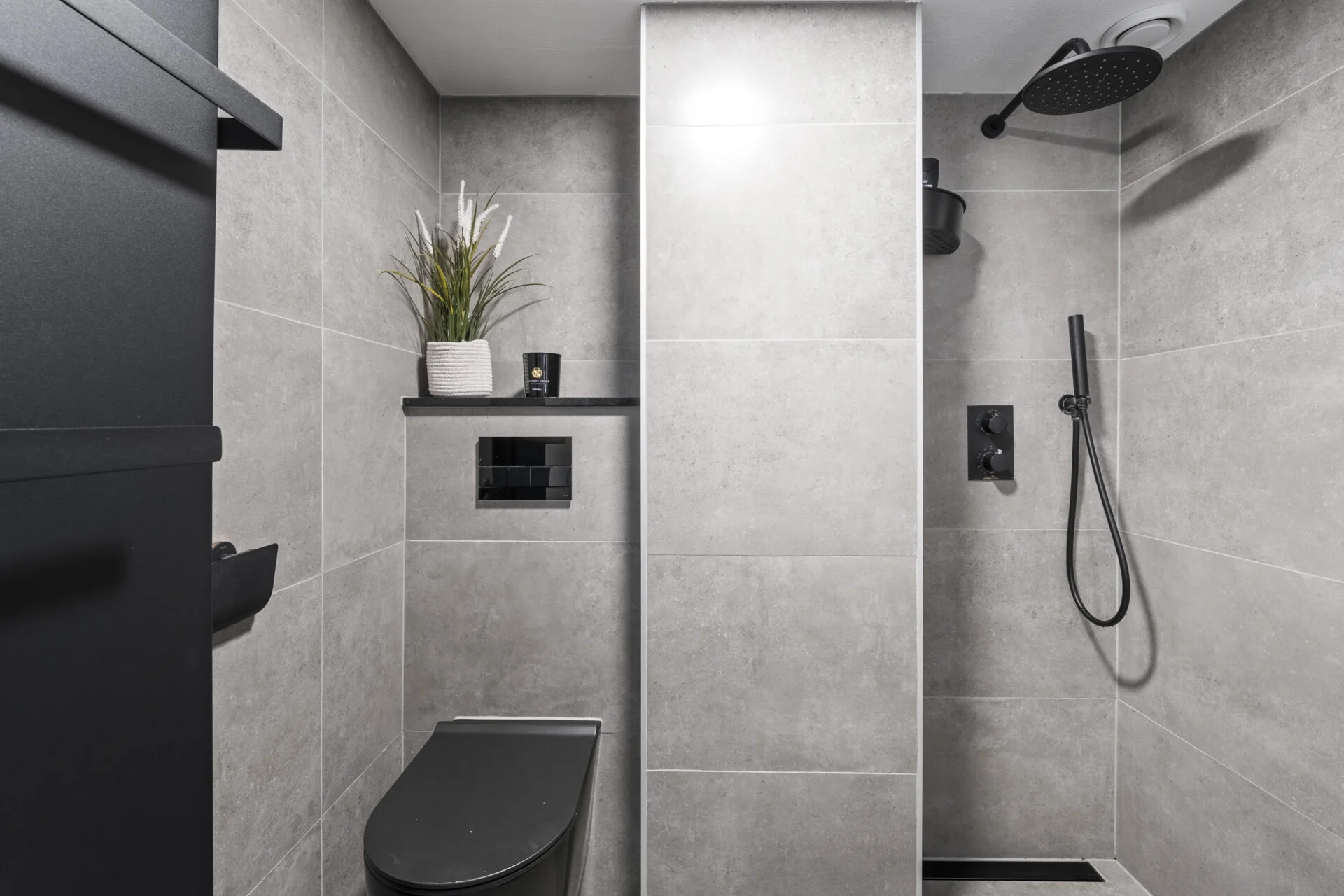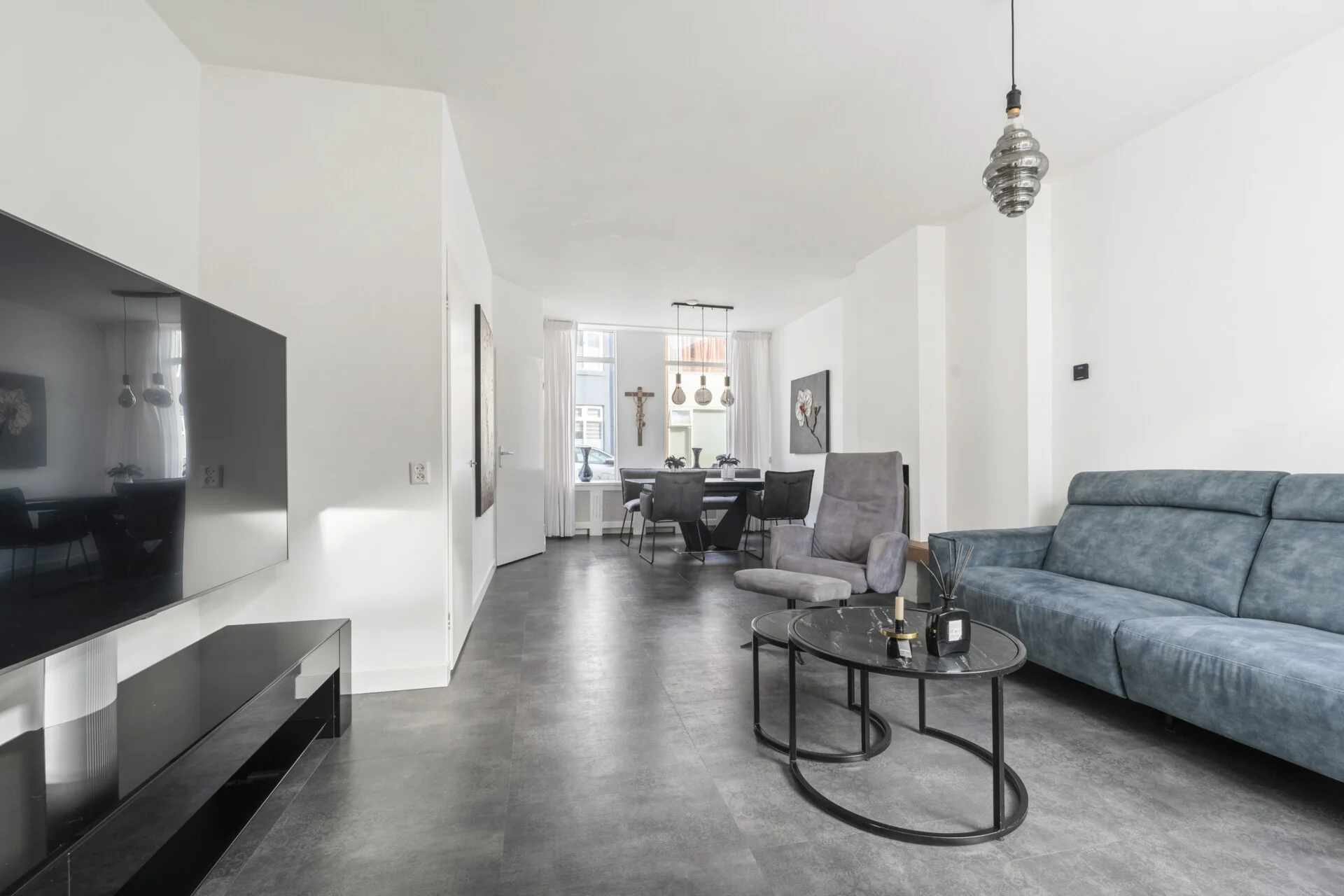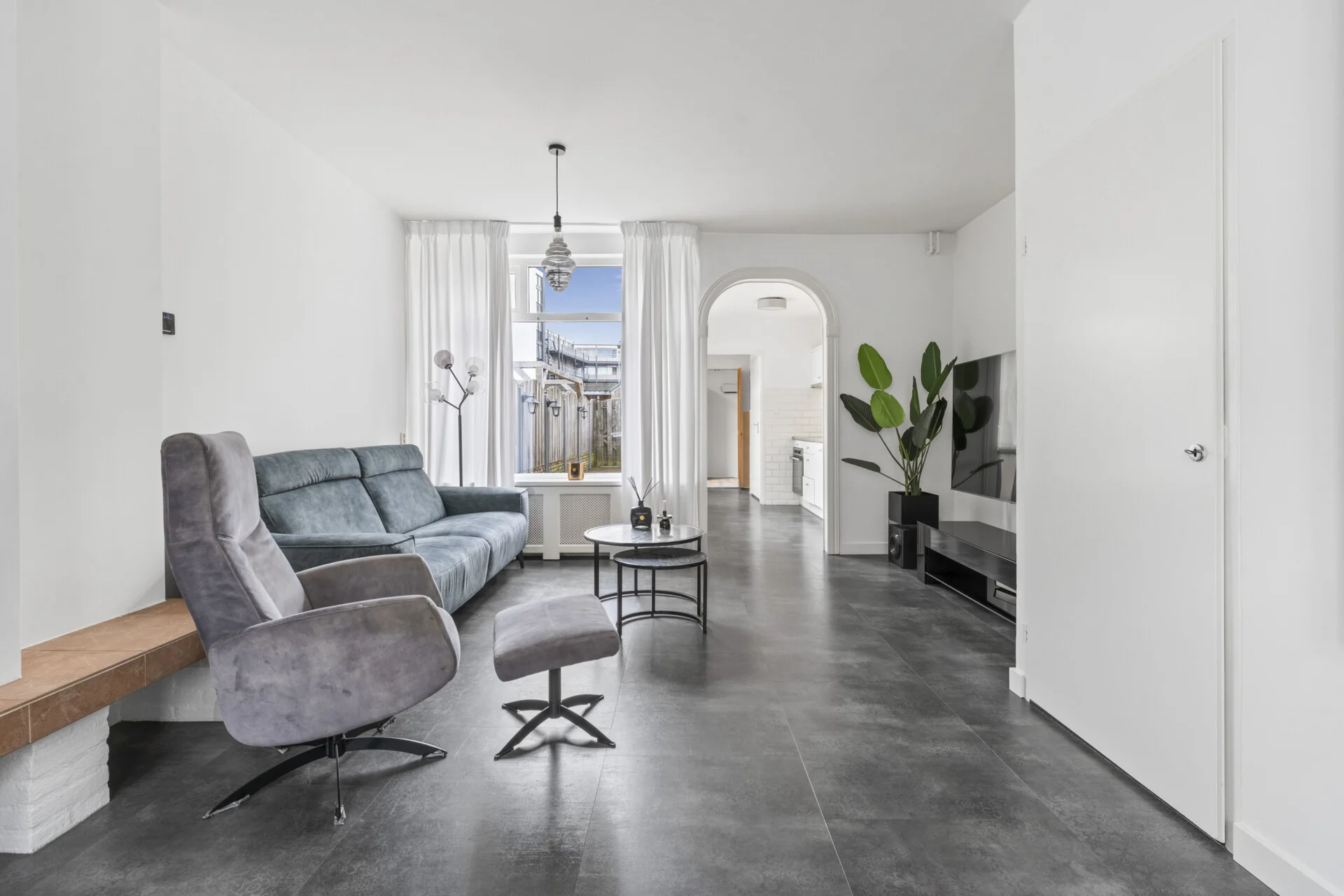 Binnen zet die sfeer zich moeiteloos voort. De woonkamer is opvallend ruim en heeft bovendien een prettige hoogte – je kunt het gerust de “extra large” versie noemen van de huizen in dit genre. Er is alle ruimte om sfeervol in te richten en verschillende woonstijlen passen hier moeiteloos, dankzij de strakke basis van gestucte wanden, plafonds en de betonnen/stenen vloer. De open haard zorgt daarbij voor extra gezelligheid en warmte.
