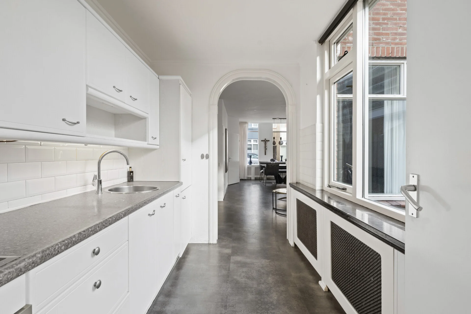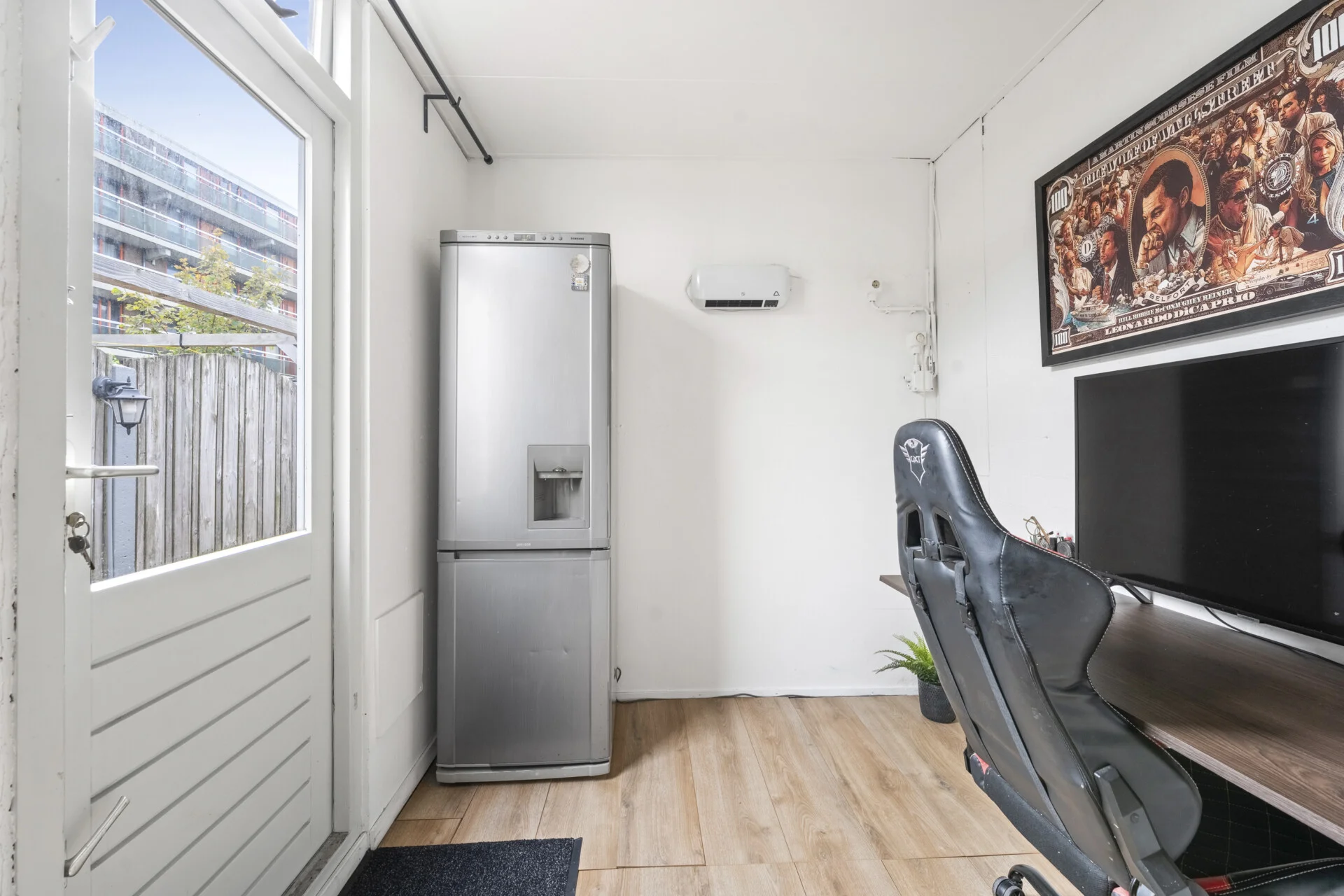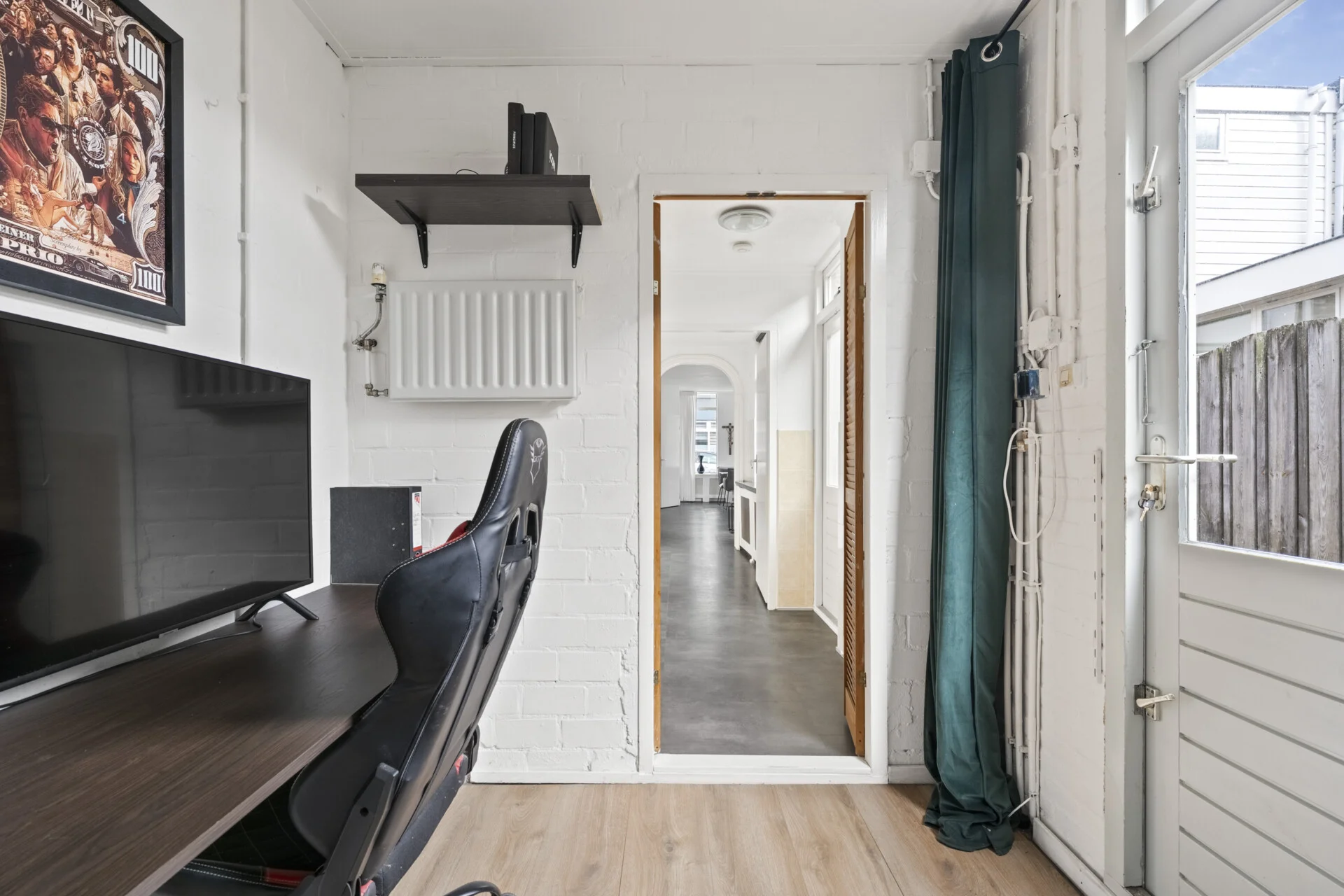 De keuken staat subtiel in verbinding met de living, deze is verzorgd maar eenvoudig en keurig voorzien van o.a. een inductiekookplaat, afzuigkap en een oven, een prima basis dus om naar eigen wens verder te verfijnen. Achter de keuken volgt een praktische passage met toegang tot het toilet, een waskast, de achterdeur naar de tuin én een inpandige ruimte die momenteel als kantoortje dienstdoet – een multifunctionele plek die je op talloze manieren kunt benutten, uiteraard ook als berging en bijkeuken.