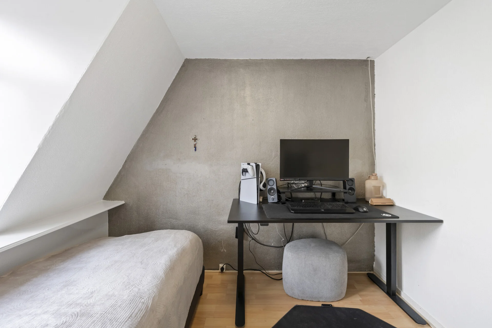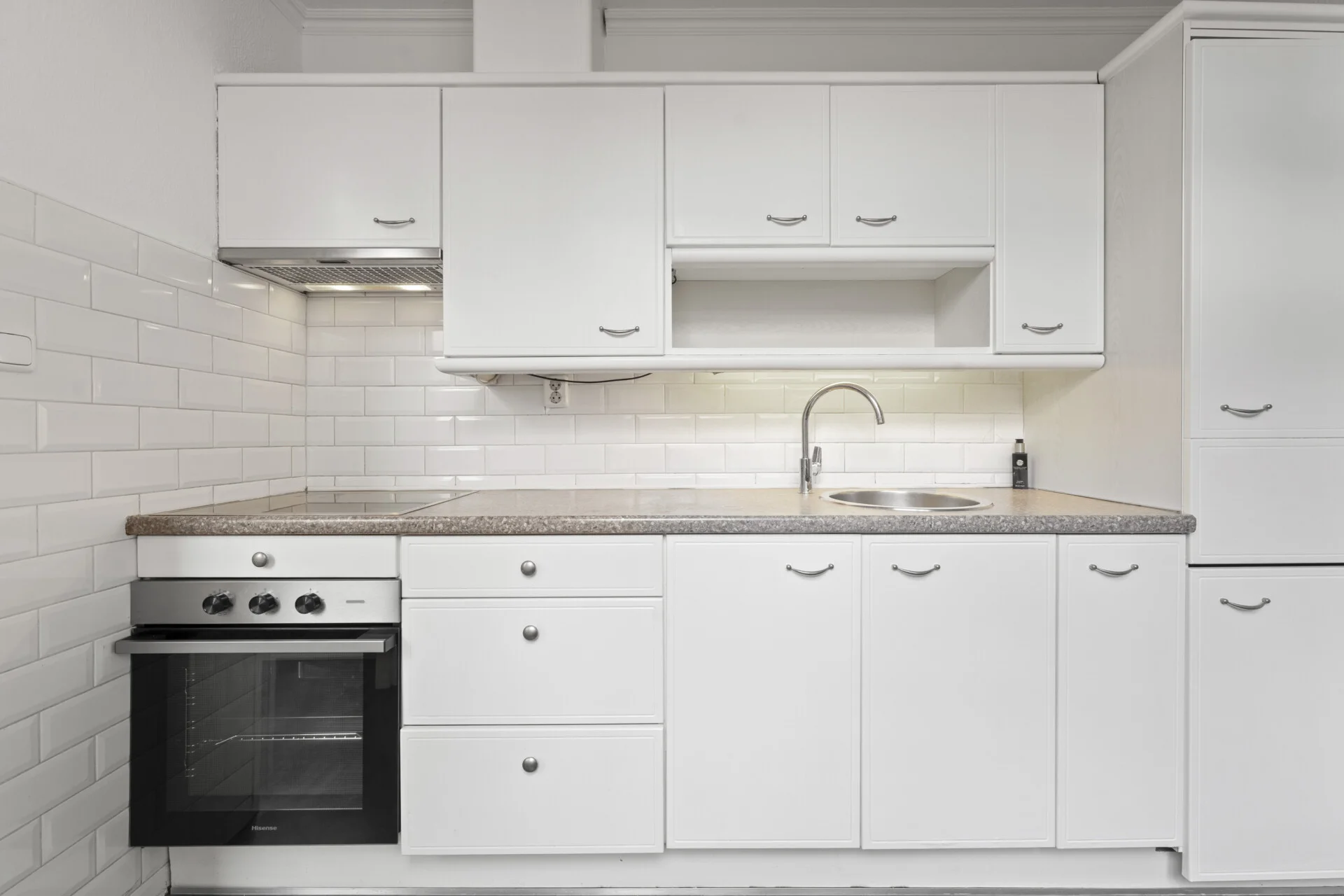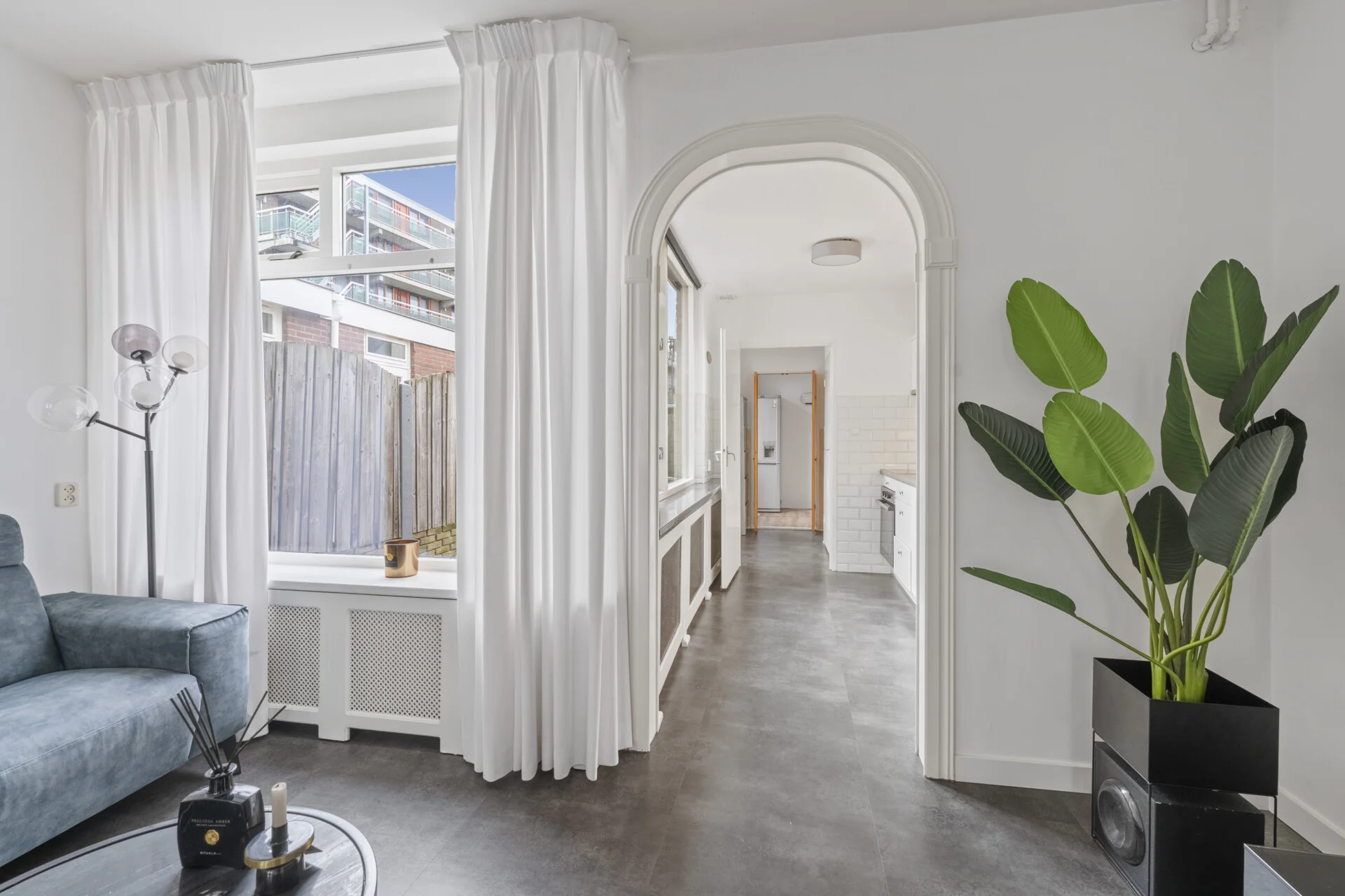 De keuken staat subtiel in verbinding met de living, deze is verzorgd maar eenvoudig en keurig voorzien van o.a. een inductiekookplaat, afzuigkap en een oven, een prima basis dus om naar eigen wens verder te verfijnen. Achter de keuken volgt een praktische passage met toegang tot het toilet, een waskast, de achterdeur naar de tuin én een inpandige ruimte die momenteel als kantoortje dienstdoet – een multifunctionele plek die je op talloze manieren kunt benutten, uiteraard ook als berging en bijkeuken.