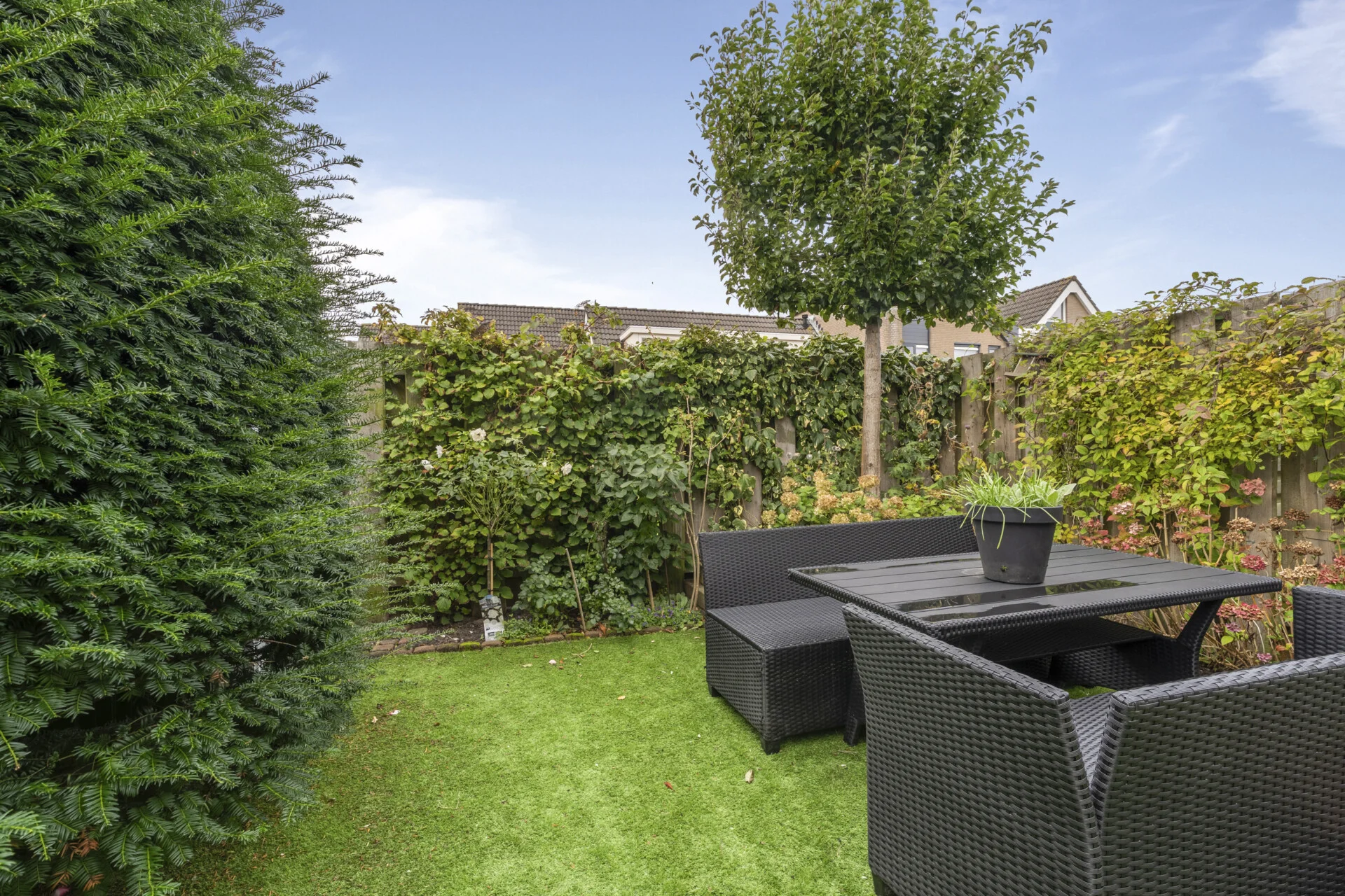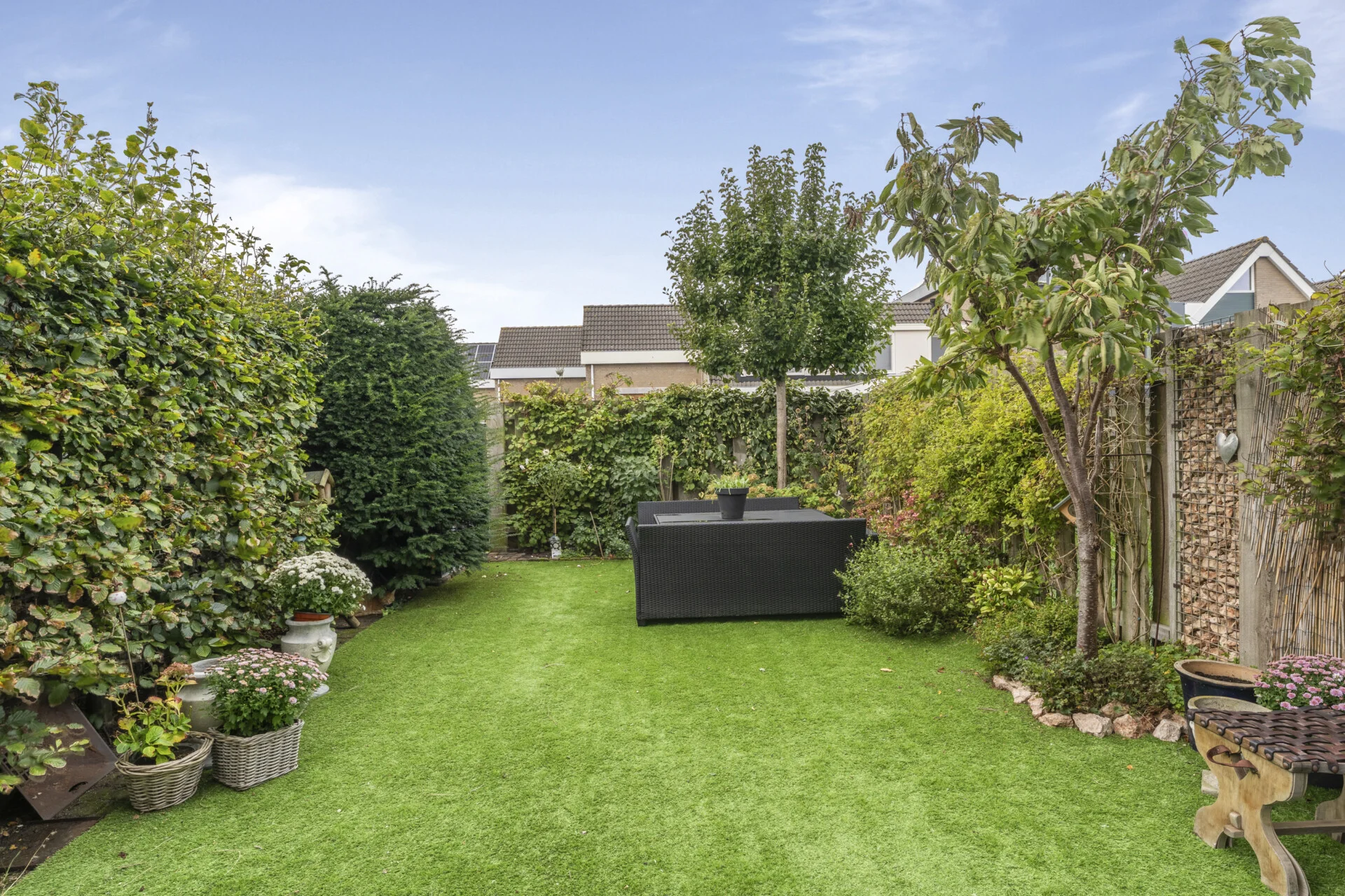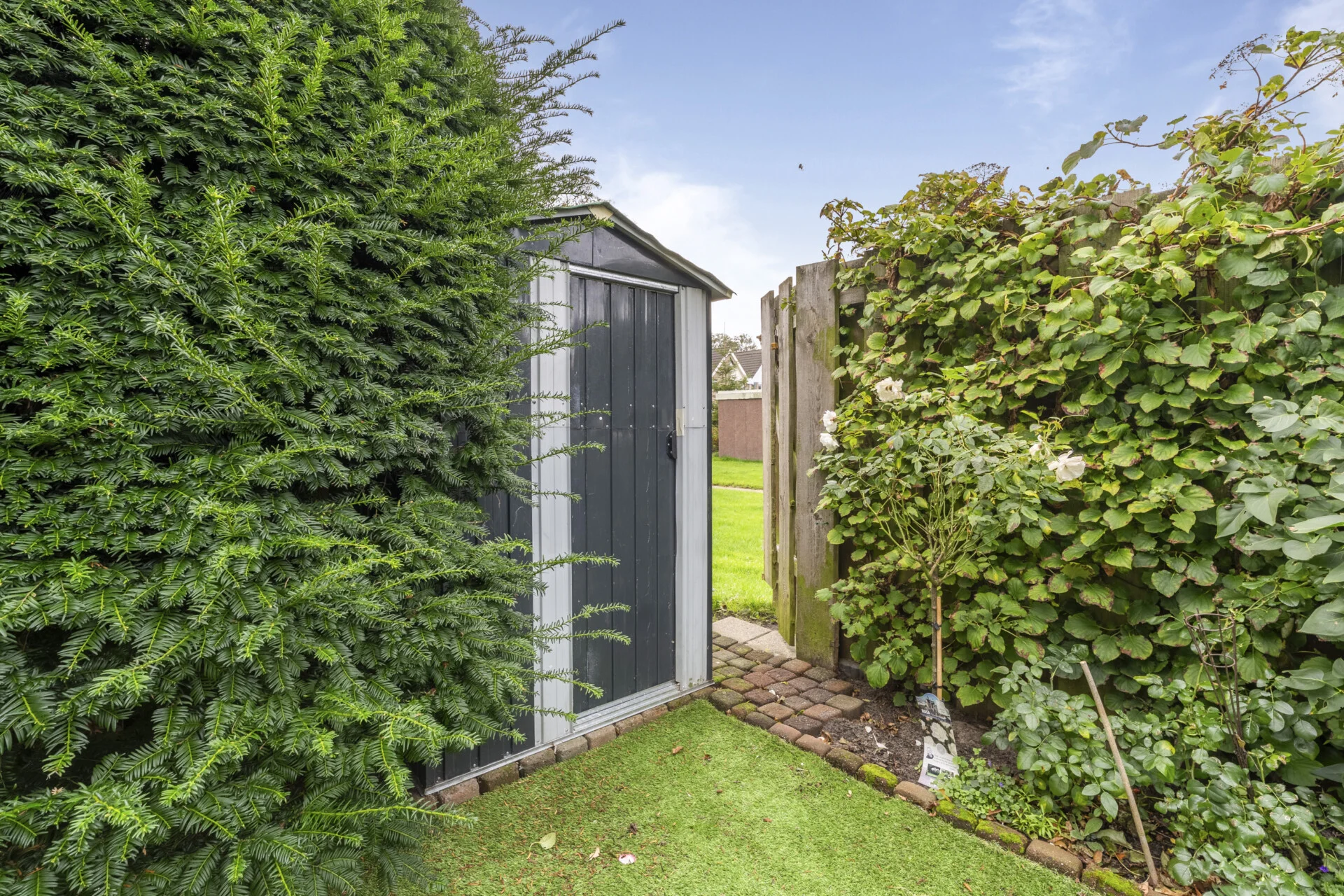 Aan de voorkant is er parkeerplek op eigen grond en staat een robuuste schuur voorzien van elektra en verlichting, heel praktisch allemaal. De achtertuin is keurig aangelegd, gunstig op het westen georiënteerd en dus ideaal voor de middag- en avondzon. Bovendien is de tuin opvallend privacyvol en, net als de woning, eenvoudig naar eigen smaak aan te passen: onder het kunstgras ligt sfeervolle bestrating, klaar om eventueel naar wens zichtbaar te maken. Zowel aan de voor- als achterkant van de woning zijn een buitenkraan en buitenelektra aanwezig, functioneel en prettig dus allemaal.