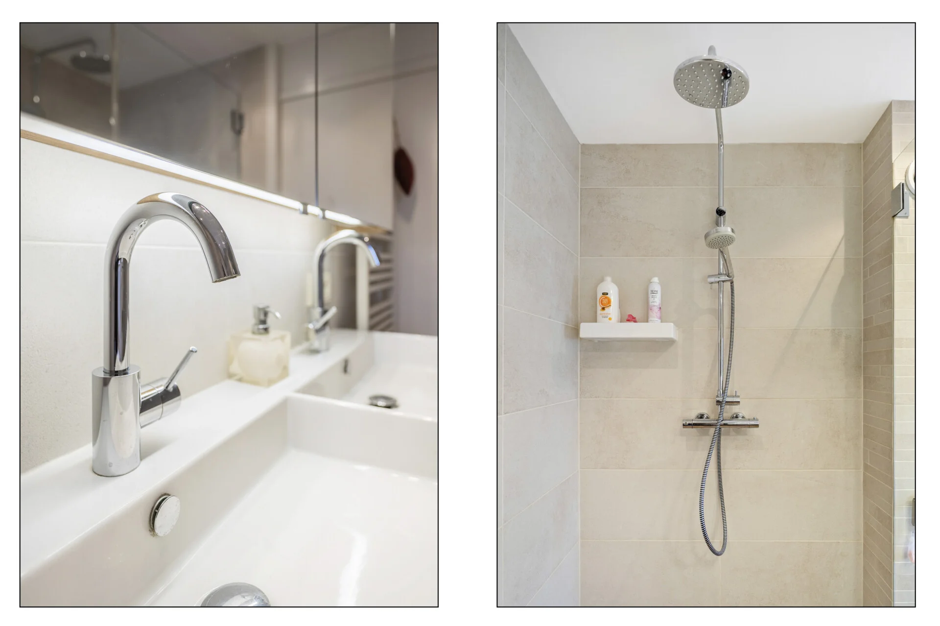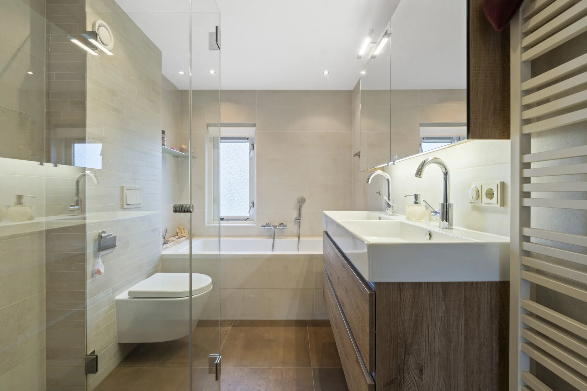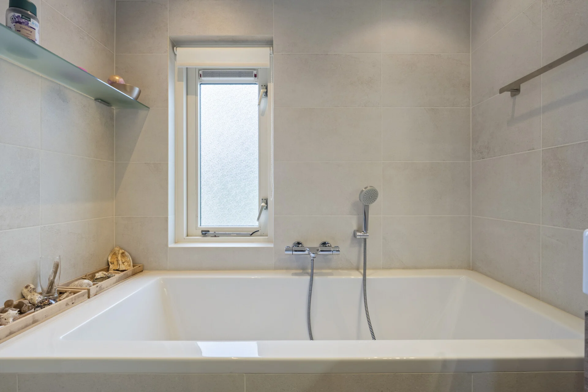 De badkamer is een echte blikvanger: ingericht met een afsluitbare douche voorzien van regen- én handdouche, een ligbad, een dubbel wastafelmeubel met spiegelkasten, een tweede toilet en een designradiator. Daarnaast is er in deze ruimte elektrische vloerverwarming, mechanische ventilatie én een raam aanwezig, samen goed voor een comfortabel en beheersbaar klimaat met het altijd zo gewenste daglicht en natuurlijke ventilatie.